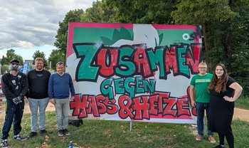 Am Kreisverkehr Vluyner Nordring / Springenweg setzten Christian Pelikan, Diane Vormann, Richard Stanczyk und der Graffiti-Künstler Steven den Vorschlag schließlich in die Tat um. Entstanden ist ein gemeinsames Kunstwerk, das die klare Botschaft vermittelt: Demokratische Kräfte stehen zusammen gegen Ausgrenzung, Zerstörung und Gewalt.